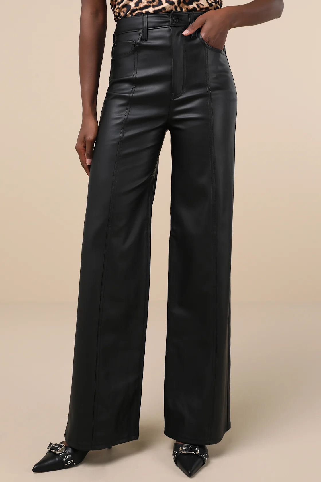 Certified cool and ready for compliments, the Daze Denim Far Out Vegan Black Vegan Leather High-Rise Wide-Leg Pants know how to have fun! Smooth faux leather shapes these trending pants with a high-rise fit, complete with belt loops, a five-pocket cut, and a hidden zip fly with a top button closure. The wide pant legs feature flattering seaming as they fall to full-length hems.