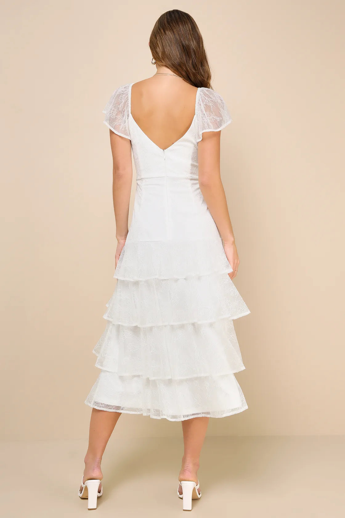 The entrance you'll make while wearing the Lulus Graceful Darling Navy Lace Flutter Sleeve Tiered Midi Dress will leave everyone enchanted! Delicate, sheer floral lace shapes this romantic dress that features a princess-seamed bodice and a V-neckline (and back), framed by fluttery short sleeves (with elastic at the shoulders). The flattering, set-in waist sits atop a tiered, A-line skirt that falls to an elegant midi hem. Hidden back zipper/clasp.